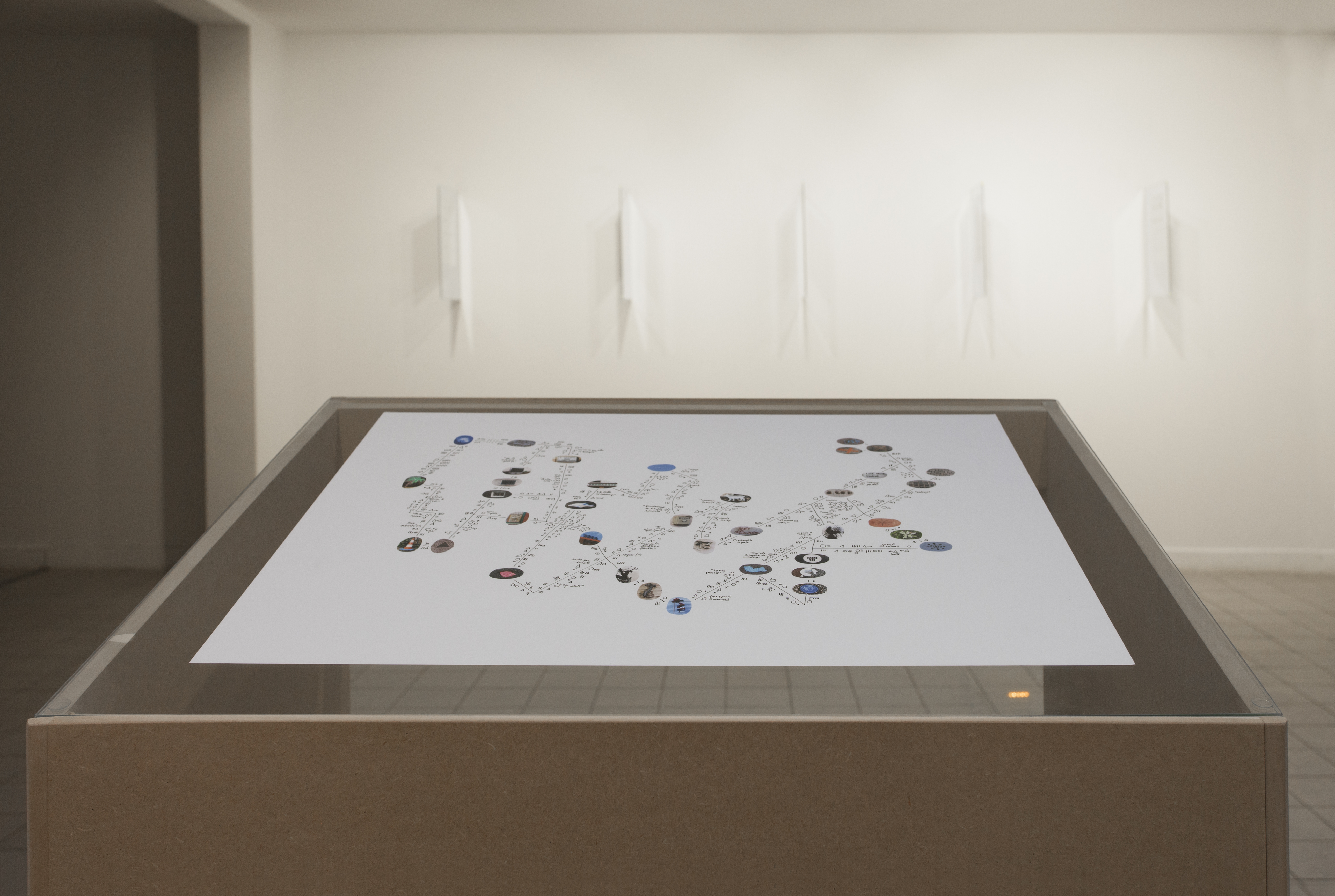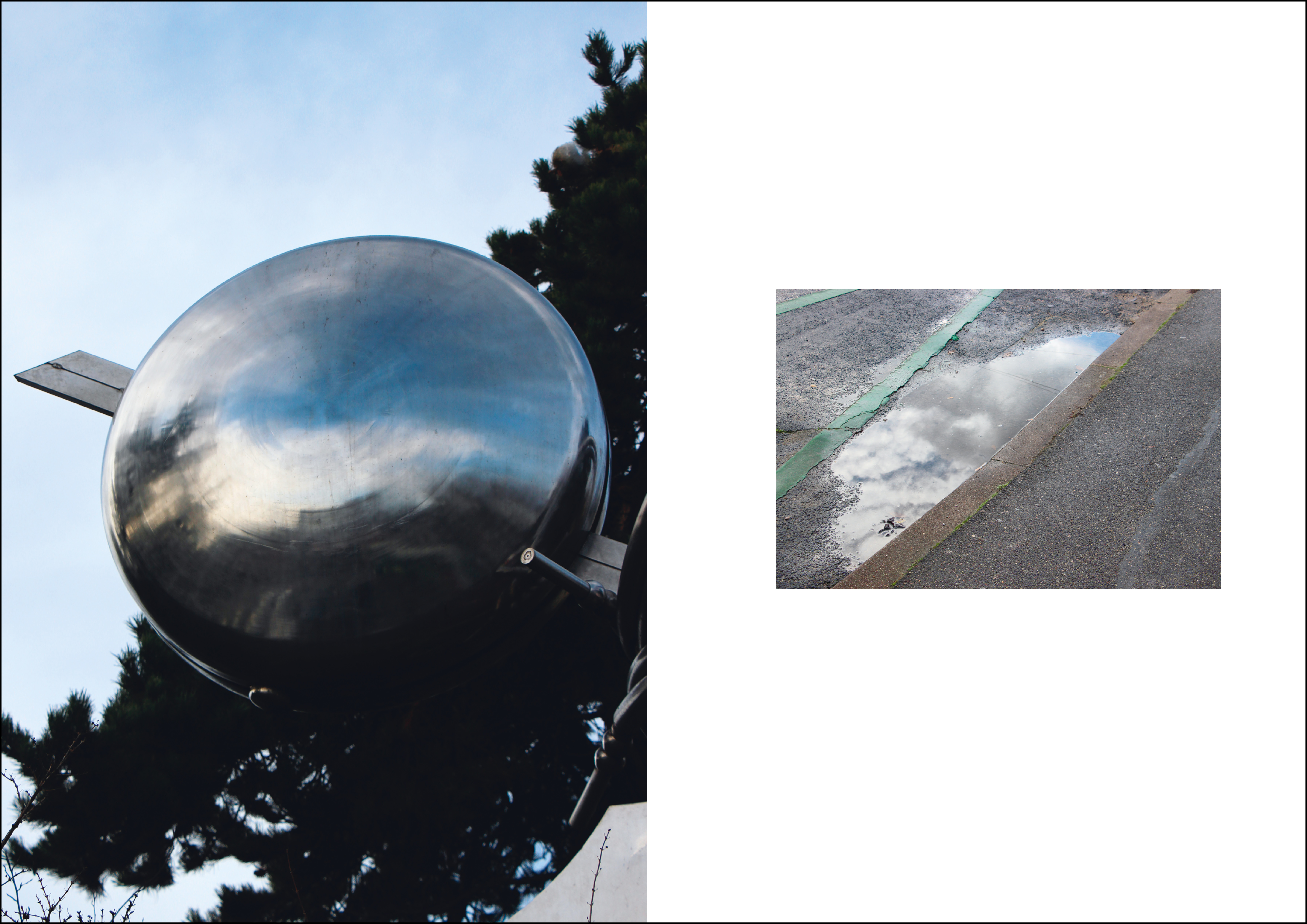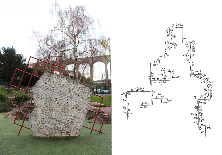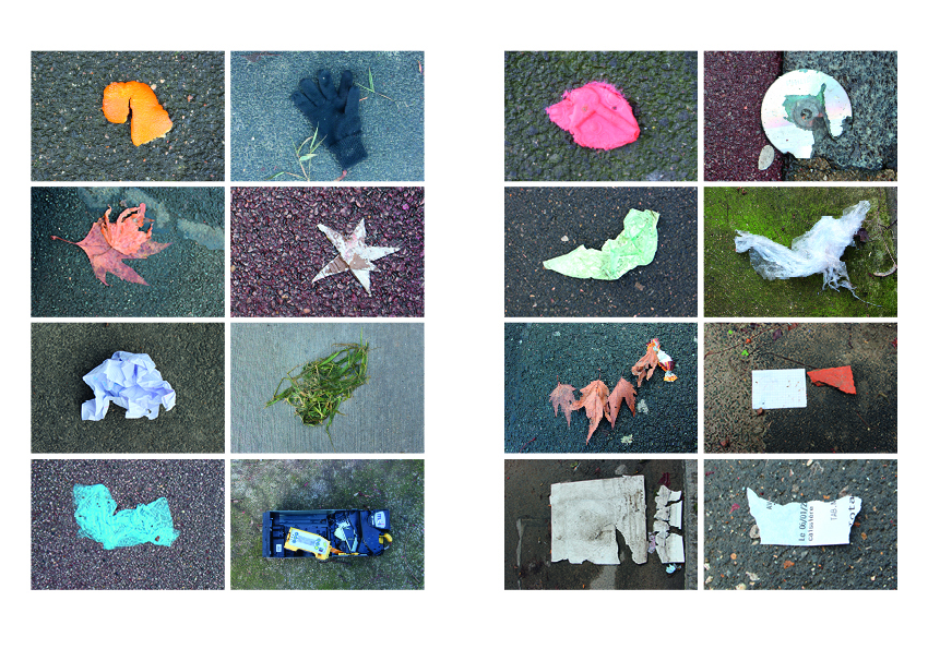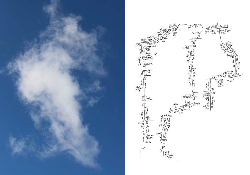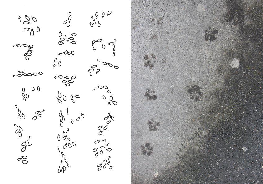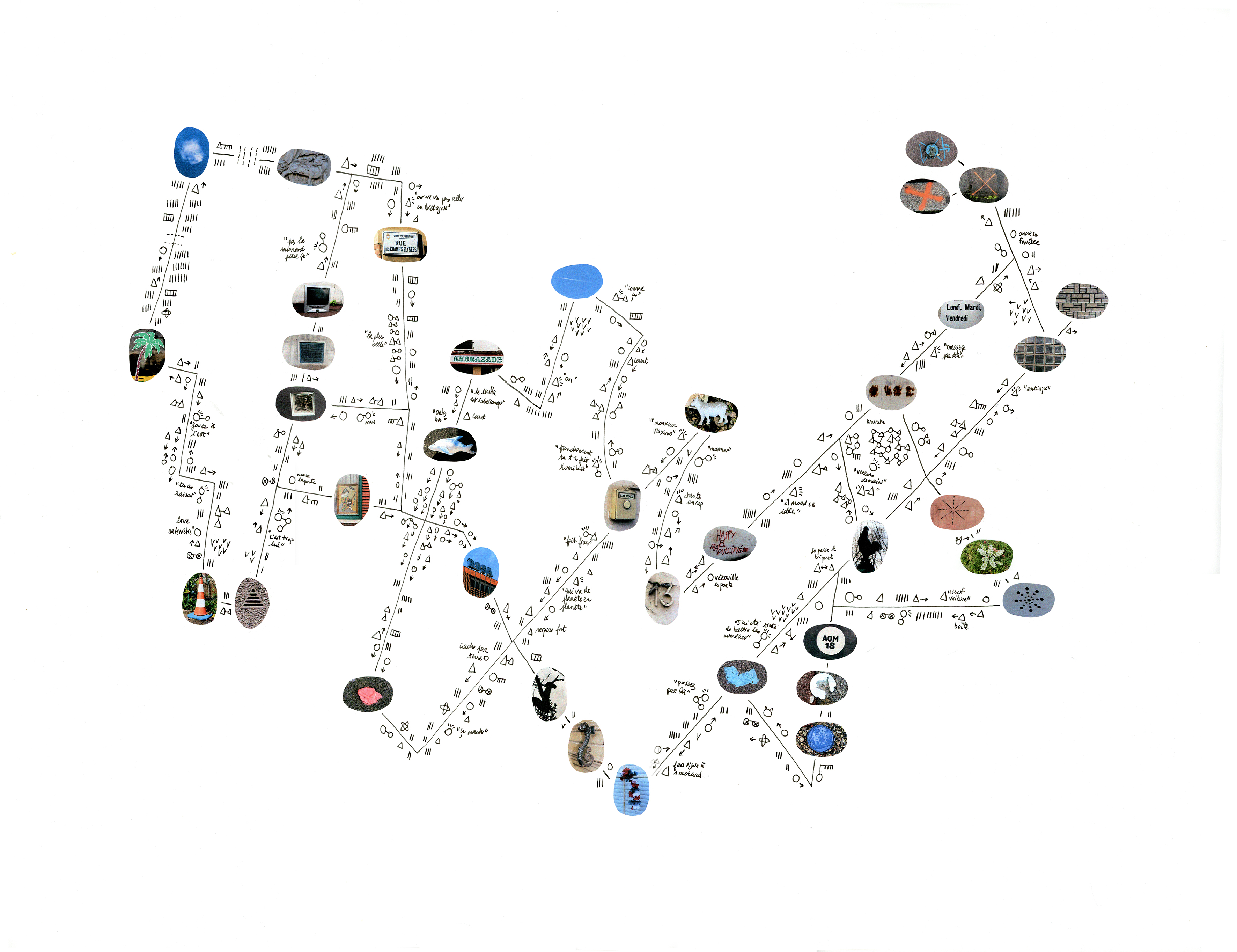 Dans les dessins se superposent la notation graphique des déplacements de la performeuse, de certaines rencontres (avec une personne, un animal, un véhicule, un objet…) et des collages de vignettes photographiques . Les prises de vue réalisées lors des promenades isolent des éléments ou des motifs pouvant être «lus» comme des messages ou des signes : étoile, cercle, déplacement d’une girouette, nuage, carte, mot, objet sur un trottoir…