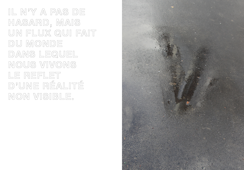 L’édition mêle ses notations « sur le vif », des photographies des « signes » (étoiles, nuages, reflets, empreintes, formes géométriques…), et des extraits d’un entretien avec l’égyptologue Yvan Koenig.