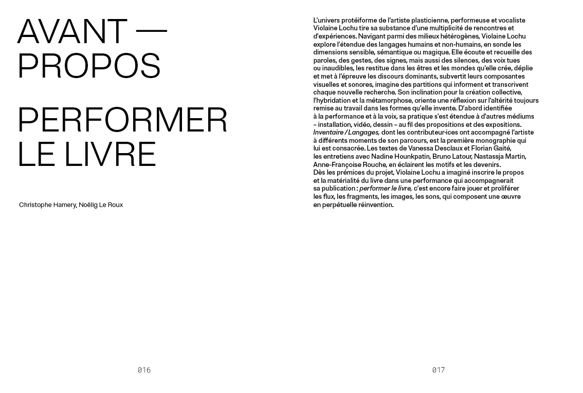 Dans Inventaire / Langages – performer le livre, Violaine Lochu incarne littéralement le contenu de l’ouvrage par la réactivation de certaines performances et la mise en acte des partitions présentées dans le catalogue. Elle joue également avec les différentes strates textuelles du livre : articles critiques, listes d’œuvres, bibliographie, index, sommaire, remerciements, notes, etc. Le livre est activé dans toute sa sa matérialité ; porté, frappé, caressé il devient tour à tour masque, instrument divinatoire, machine médicale, miroir, grand tétras…
