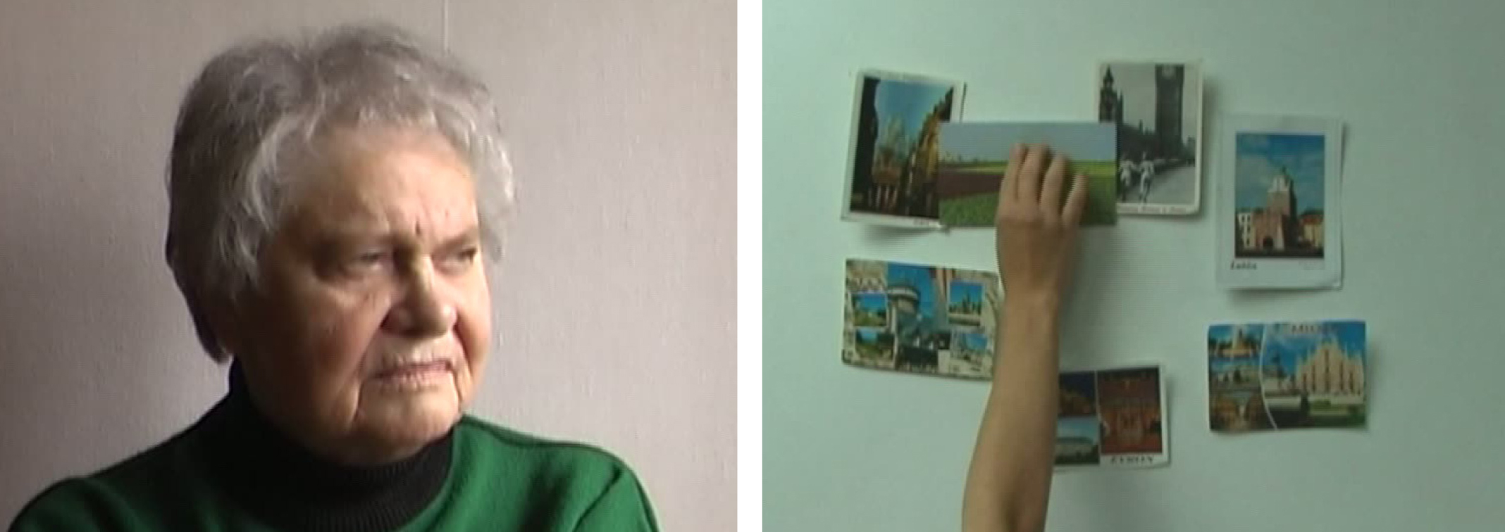 “First image: Postcards from different places where i’ve lived fall from a wall. I try in vain to put them back up. Second image: my grandmother’s face. She refuses to answer the questions i ask her about my family. She speaks very little, mumbles, her face is tense, and at times on the edge of tears.”