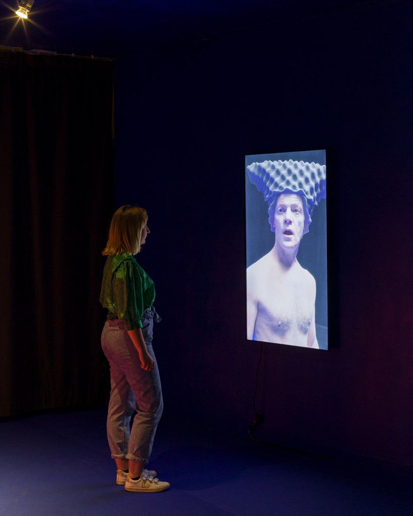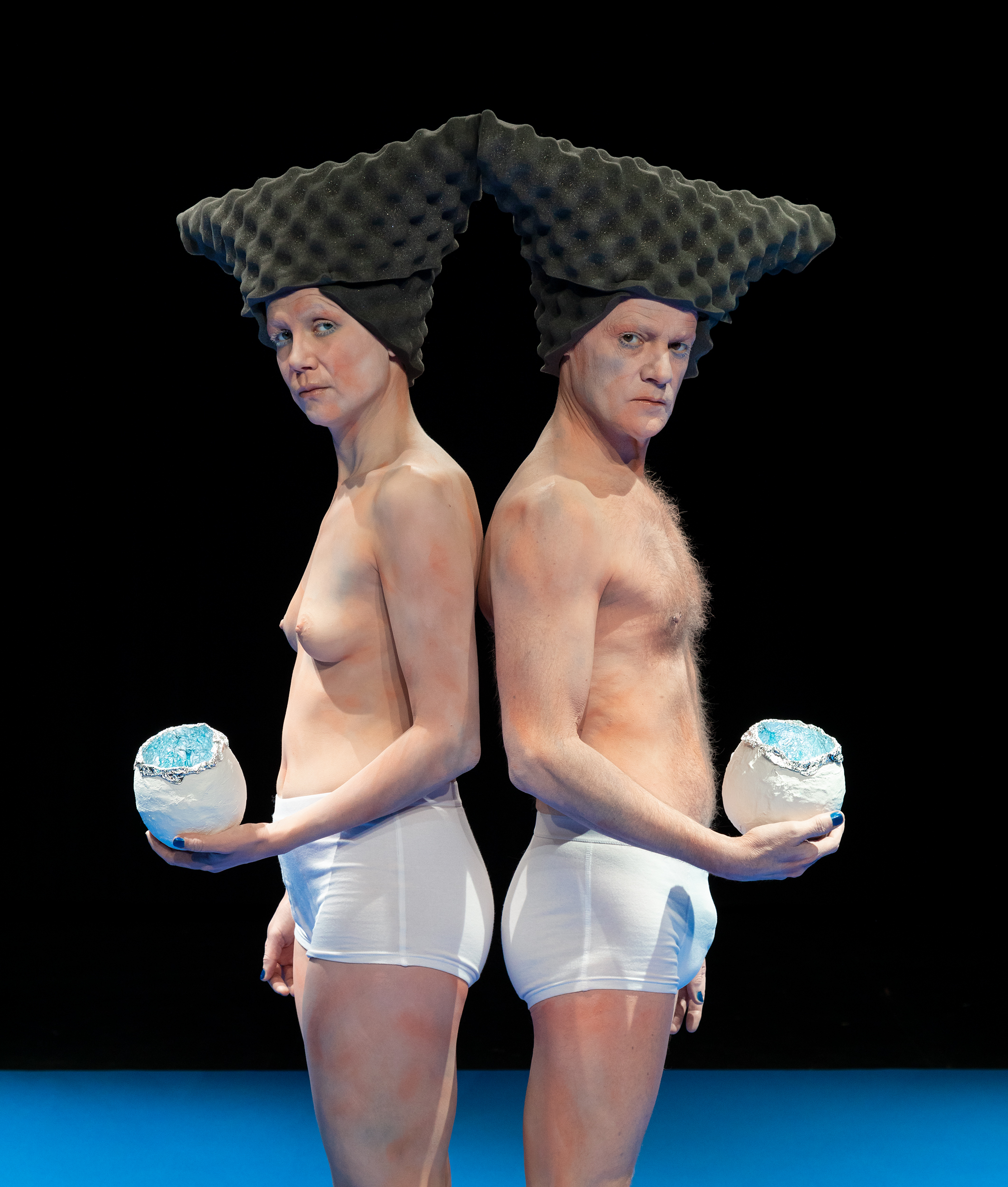 At the invitation of the Théâtre de Vanves, Violaine Lochu proposes to carry out an exhibition project based on this myth. At the crossroads of installation and set, the display shows a performance video shot in situ, featuring the artist and a second performer. By pursuing the avenues explored during the artist’s last exhibitions, the project combines references to anticipation and science fiction (through the use of specific materials – aluminum, silicone, agglomerated foam, colored lights, etc.), queer aesthetic (work on make-up, costumes) and summons different practices (choreography, acting, singing) to question the notions of gender assignment, soul-mate, separation